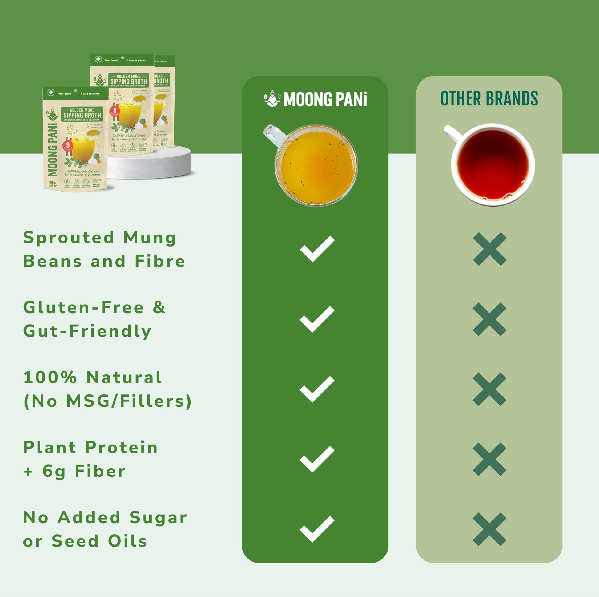 Moong Pani’s Italian Herb & Turmeric Broth starts with sprouted mung beans—packed with plant protein and fibre—and layers of basil, rosemary, oregano, garlic, and golden turmeric for a warm, gut-soothing and nostalgic sip. Just add hot water.