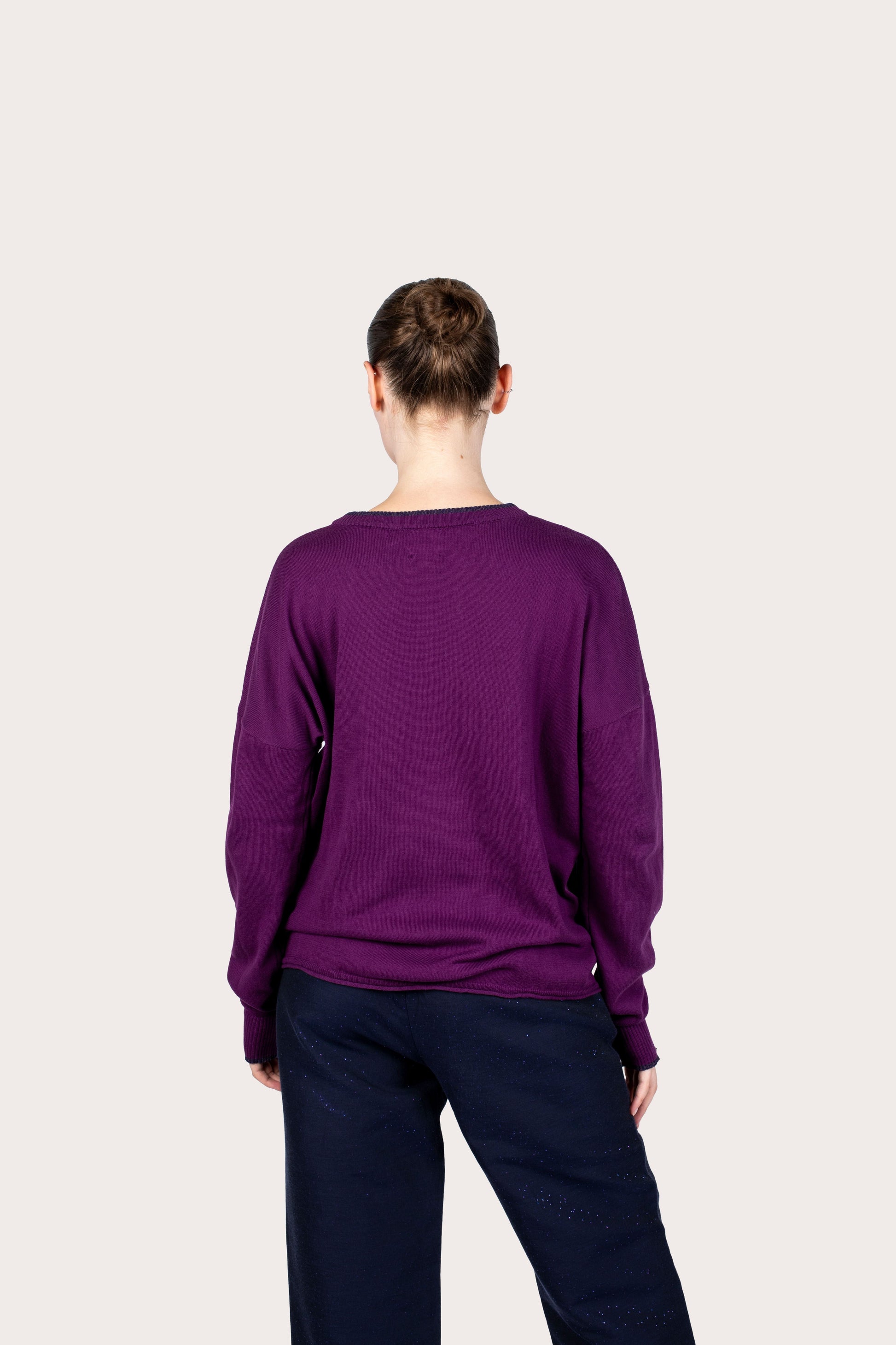 The Pauline Purple sweater embraces colorful elegance, the result of a unique Italian artisanal collaboration. Knitted on vintage machines in Tuscany, it combines tradition and modern style in a strong eco chic expression. Made from 100 percent recycled cotton, this design gives a second life to end of life fibers. Its bold detail: a thumb hole at the end of the sleeve, adding comfort and character. Choose a truly committed and original garment.