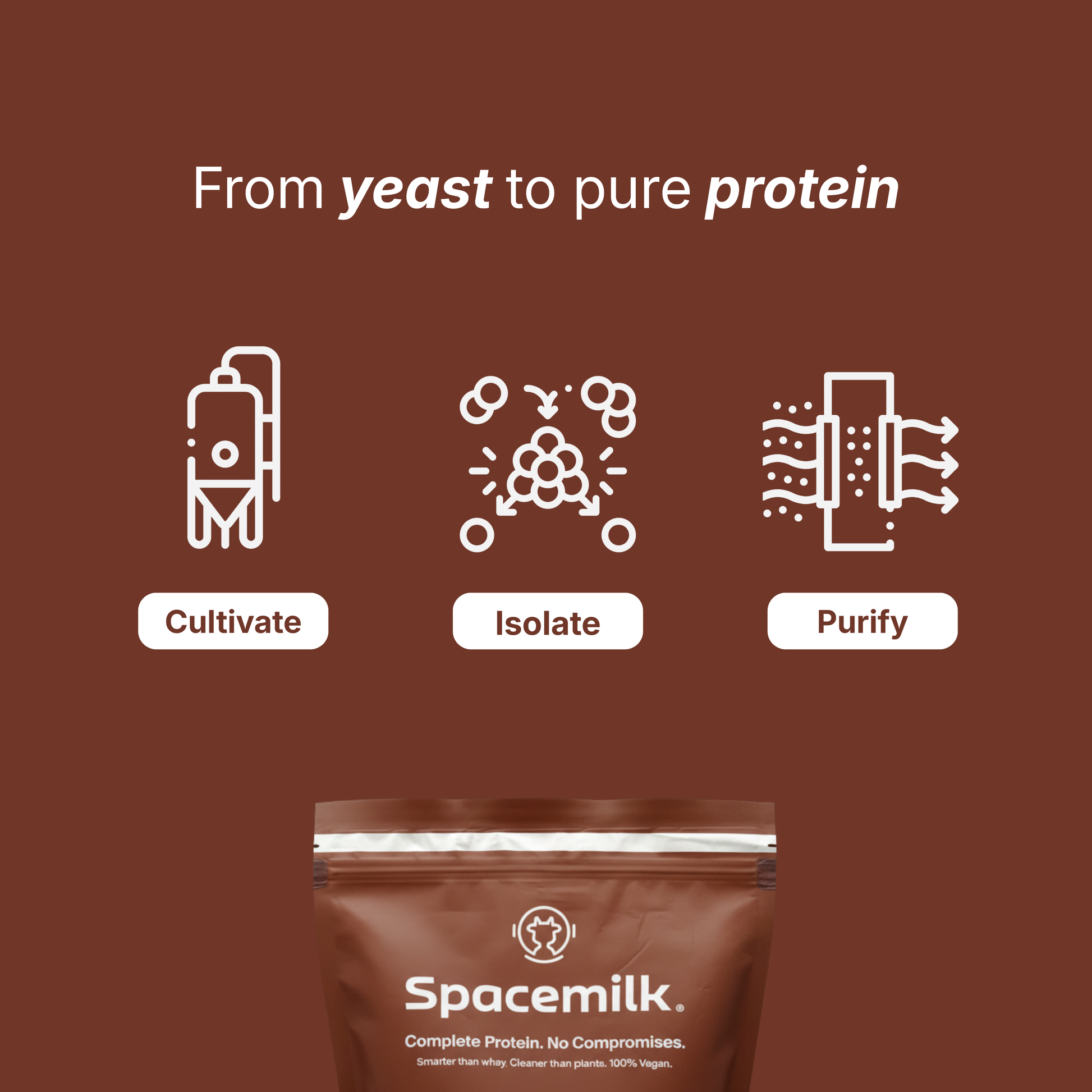 Spacemilk is the first product of its kind. Spacemilk provides 20 grams of complete protein per serving without allergens, bloating, or unnecessary fillers. It is made from non-GMO baker’s yeast, ensuring better digestion and a more sustainable protein source.