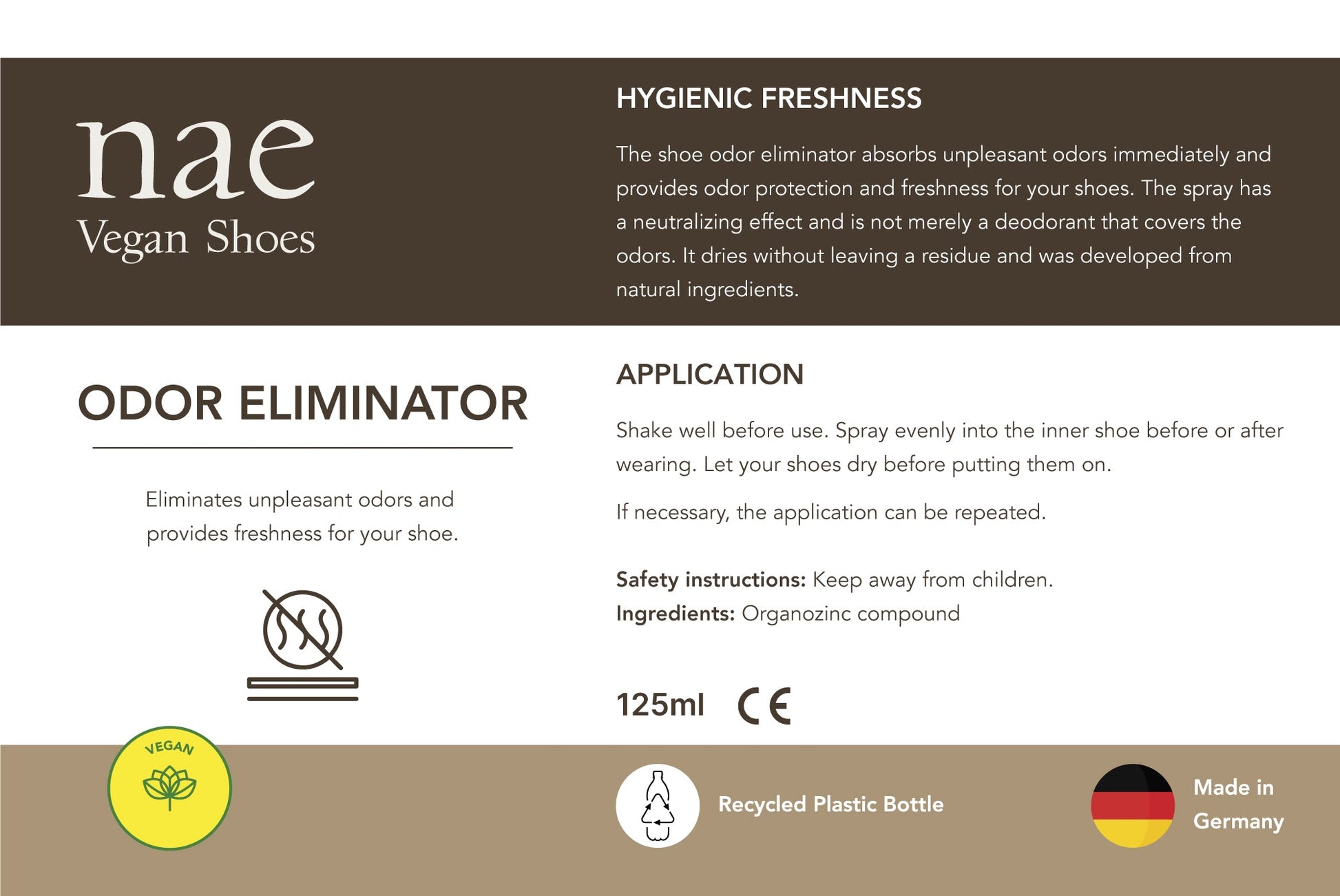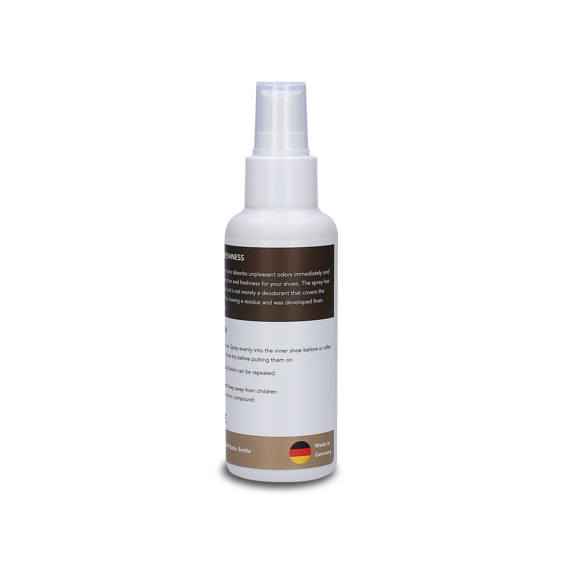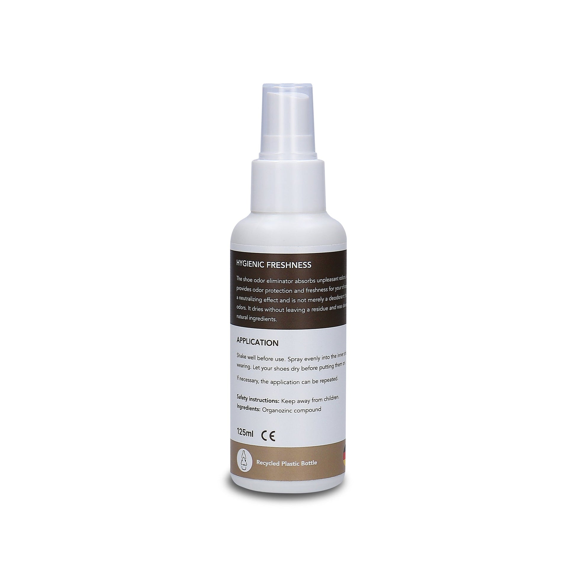 Discover our Vegan Shoe Odor Eliminator Spray—an eco-friendly solution for shoe care. Swiftly absorbing unpleasant odors while ensuring long-lasting freshness and odor protection for your shoes. Unlike typical deodorants, it neutralizes odors without leaving residue, formulated from natural ingredients. Shake well before use, spray evenly into the shoe's interior before or after wear, allowing them to dry completely. For enhanced freshness, repeat application as needed. Crafted in Germany using environmentally friendly materials in fair work environments and packaged in recycled plastic bottles, this odor eliminator spray offers a sustainable way to maintain shoe hygiene and comfort.