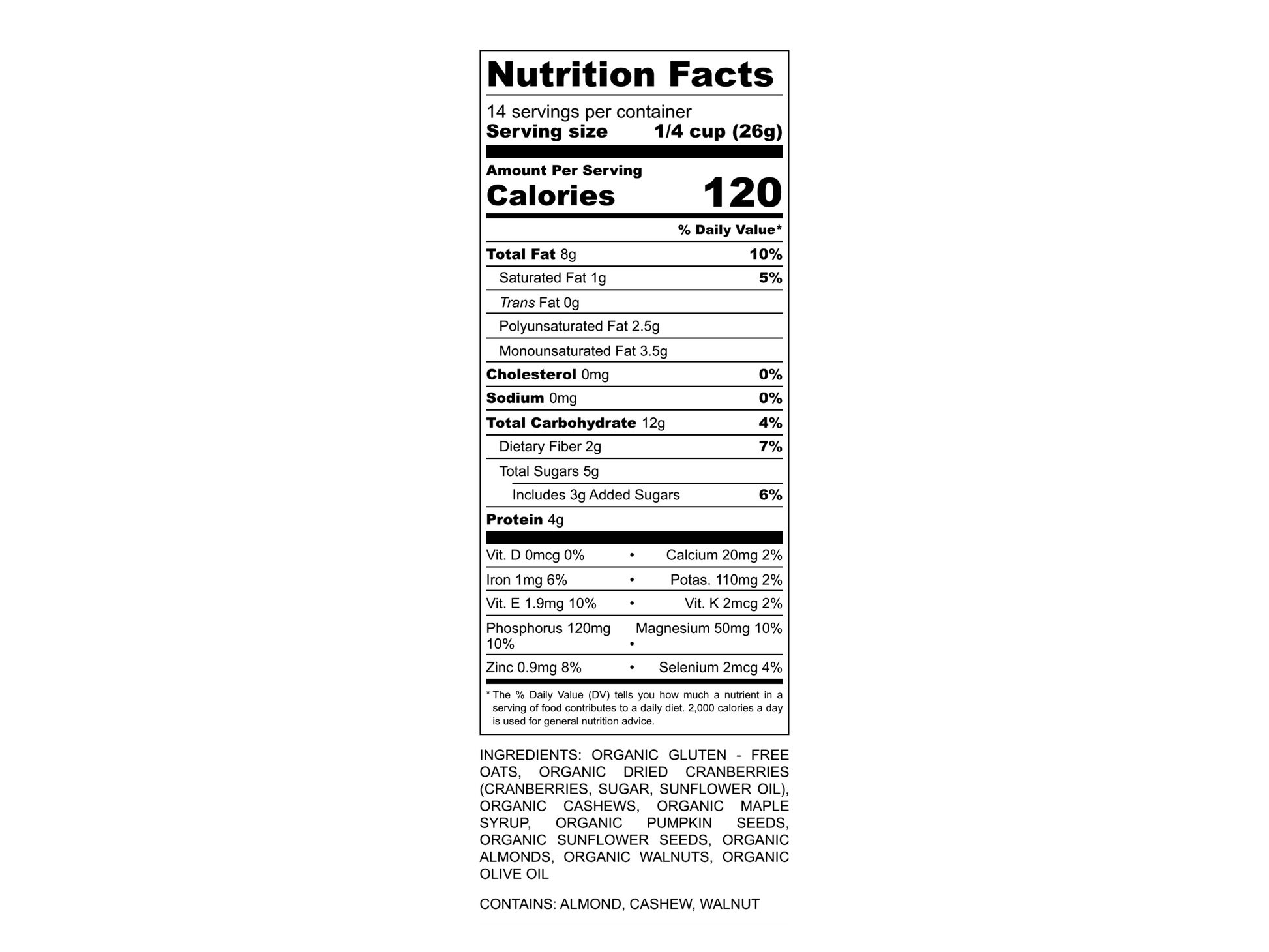 Ingredients: Organic Gluten-free Oats, Organic Dried Cranberries, Organic Cashews, Organic Maple Syrup, Organic Almonds, Organic Pumpkin Seeds, Organic Sunflower Seeds, Organic Walnuts, Organic Extra Virgin Olive Oil