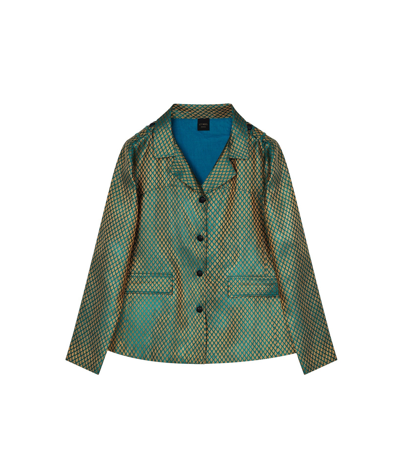 The Alice jacket, made from recycled polyester, is a straight cut blazer. It is fully embroidered with metallic jacquard designs and features the iconic LO NEEL embroidery on the back.